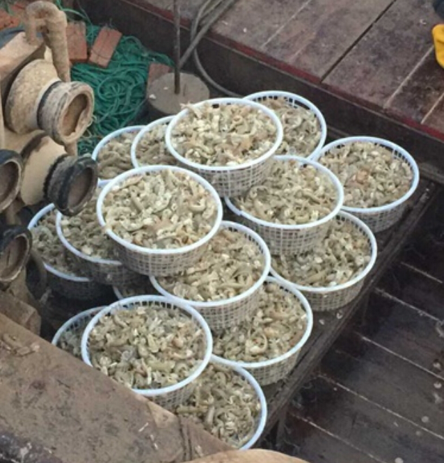 船老大们洋溢着幸福的笑容,把一船船活蹦乱跳的虾虎和鱼蟹搬上岸。