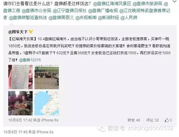 10月8日,青岛网友“四爷天下”就在微博爆料称遭遇“红海滩天价菜”:
