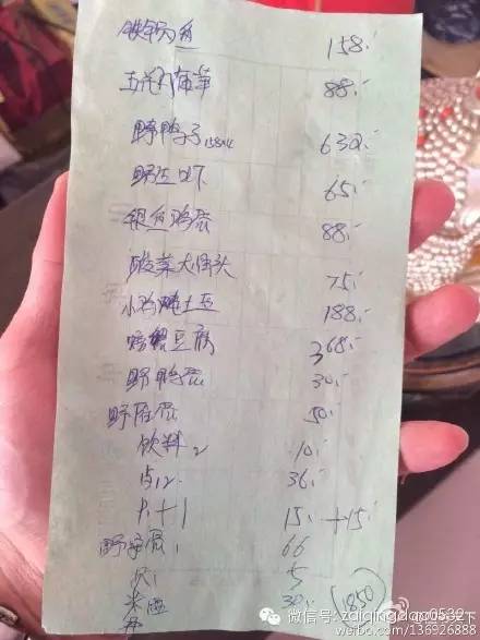 该微博中一张账单上标明:螃蟹豆腐368元,野鸭子632元。