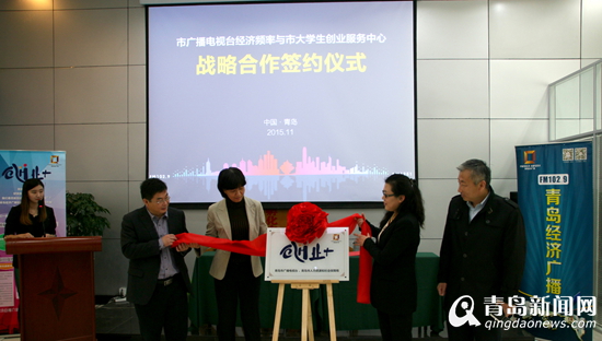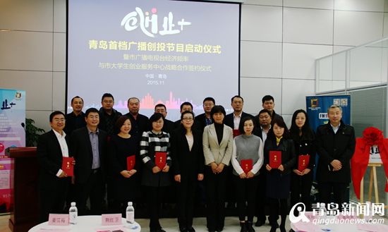 青岛新闻网讯 11月6日上午10点,青岛首档广播创投节目《创业+》开播启动仪式,暨青岛市广播电视台经济频率与青岛市大学生创业服务中心战略合作签约仪式,在大学生创业孵化中心一楼众创空间隆重举行。青岛经济广播总监荆红卫、副总监高然、青岛高校毕业就业处处长姜雪梅、青岛大中专毕业指导中心主任褚庆柱一同参加了节目的启动签约仪式,并为新节目进行揭牌。