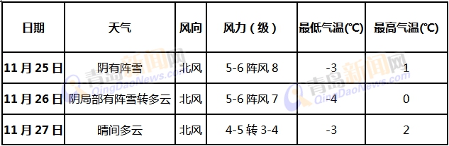 青岛新闻网11月24日讯 青岛新闻网记者从市气象局获悉,今天白天我市,阴有小雪,北风5-6级阵风8级,早晨的最低气温市区-1.4℃,其他区市最低在莱西-2.1℃,白天的最高气温市区-0.5℃,其他区市最高在平度0.2℃。
