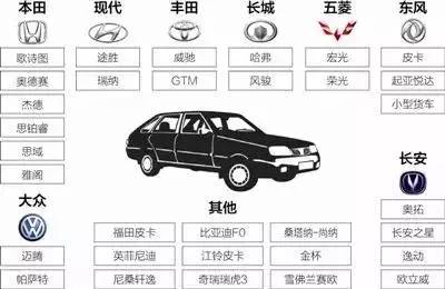 本田:歌诗图、奥德赛、杰德、思铂睿、思域、雅阁 现代:途胜、瑞纳长城:哈弗、风骏五菱:宏光、荣光 东风:皮卡、起亚悦达、小型货车大众:迈腾、帕萨特长安:奥拓、长安之星、逸动、欧力威