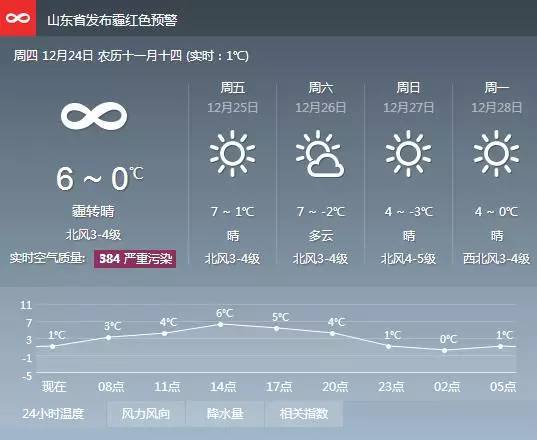 23日,省气象局于早上将霾橙色预警信号升级为霾红色预警信号。截止到上午10时,全省共有7个城市空气质量达到严重污染,德州、聊城空气质量指数(AQI)“爆表”,连一向以蓝天白云傲视全省的青烟威3市也未能幸免,全部达到重度污染级别。目前,东营、滨州、德州、聊城、济南、潍坊、济宁和菏泽等市均出现严重霾,能见度小于200米,部分地区能见度小于50米。