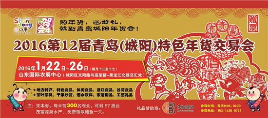 喜气洋洋辞旧岁,金猴献瑞送春来!2016第12届青岛(城阳)特色年货交易会(简称:青岛城阳年货会),将于2016年1月22日-26日(腊月十三至十七),在山东国际农展中心(城阳区文阳路)隆重举行。