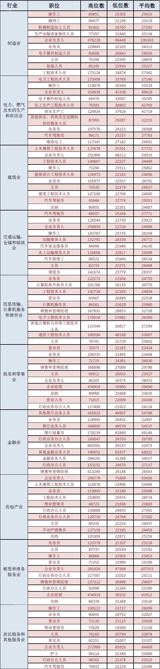同一岗位在不同行业中的工资也有较大区别,例如企业负责人岗位在工艺品及其他制造业平均年薪最高,为181275元。而在交通运输、仓储和邮政业为24999元。