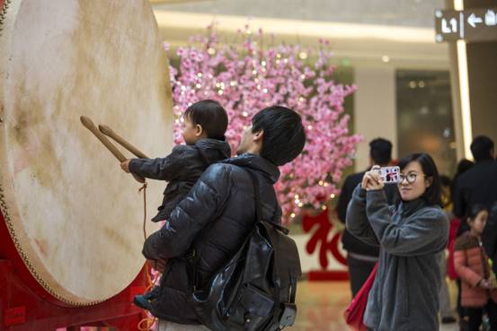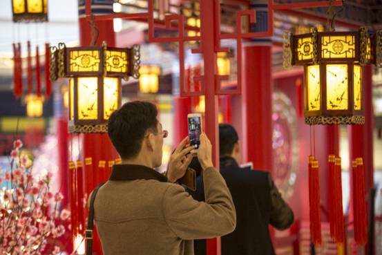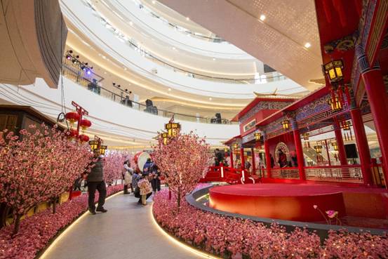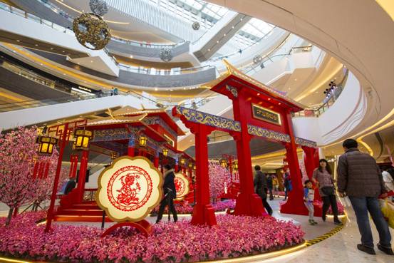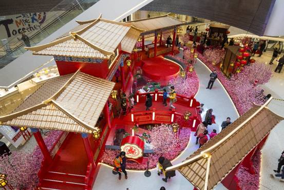 中国人的新年讲究“大红灯笼高高挂”,“人面桃花相映红”,万象城更是从1月15日便红意满满,璀璨迎新。走进万象城一层中庭,你就会看到雕梁画栋、金瓦覆顶,一片古典园林景色展现在眼前,中国古典风扑面而来。这个大型艺术景观占地200余平米,以北方皇家建筑楼阁为主设计元素,搭配桃花、水池、荷花、鼓等中国传统元素,同时还融入几分唯美的时代感,构思超俗,设计新颖,可谓精美细致“浓缩版”的皇家园林。设计师又利用中国红、剪纸、红灯笼、猴等春节文化元素与园林相结合,整个景观小中见大,迂回曲逝,步移景异,既散发着古朴韵味,又有中国古典喜庆祥和的春节气氛。