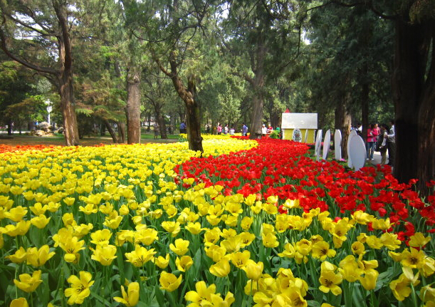 每年4月中下旬,中山公园内除了樱花,西侧郁金香也会大面积开放,红、黄、白、金各色花朵格外惹人喜爱。浪漫飘逸的樱花,高贵雍容的郁金香,中山公园迎来最佳赏花季。