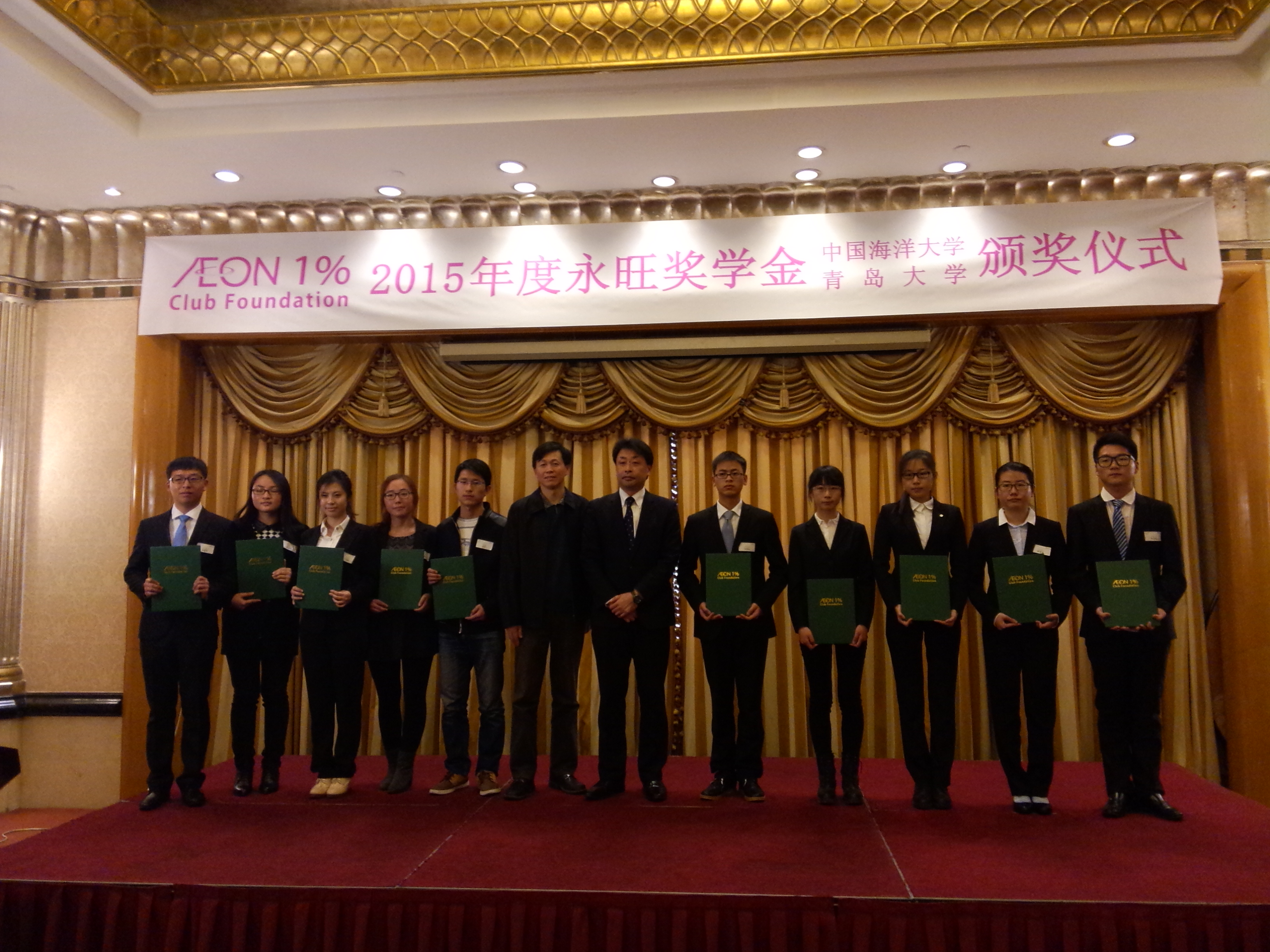 3月6日,2015年度永旺奖学金颁奖仪式在青岛颐中假日酒店举行。青岛市人民政府外事办公室主任高群、日本国驻青岛总领事馆总领事远山 茂、日本永旺1%俱乐部财团理事长兼日本永旺株式会社董事长横尾 博、青岛永旺东泰商业有限公司总经理中川 伊正,以及中国海洋大学学生工作处处长初建松、青岛大学副校长汪黎明等领导出席颁奖仪式。