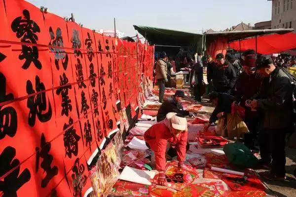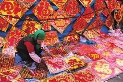 对联市里,写满吉言的大红对联一排接一排,沿东西河道一溜挂起,形成一条条长卷;地摊上摆满五颜六色的过门帖;方方正正的大“福”字,四角衬着“富贵吉祥”、“年年有余”烫金字,格外显眼。从远处望去,对联市里红红火火,自成一景。