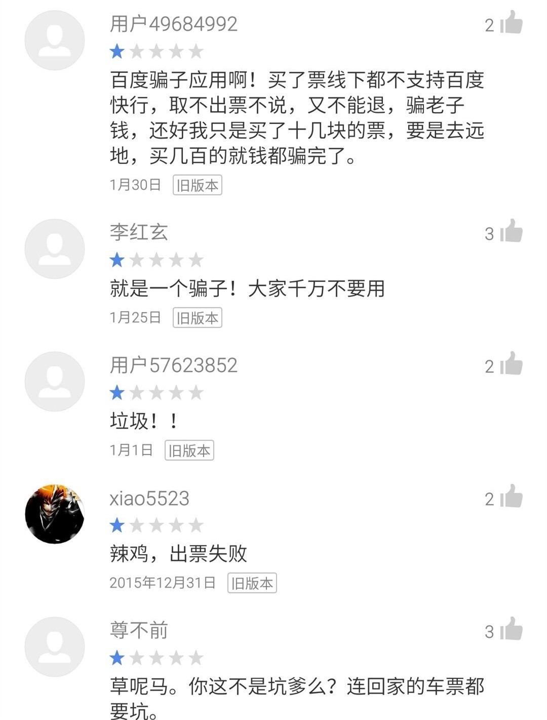 △安卓的几个应用市场里的网友对百度快行的评论。