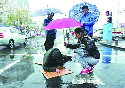 “最美路人”雨中撑起爱心伞