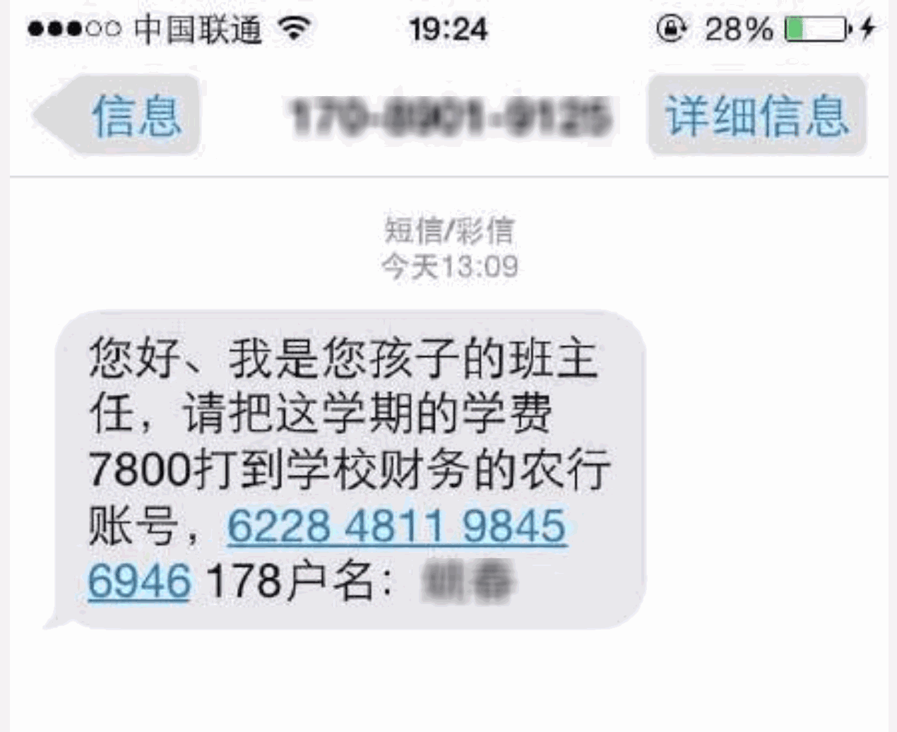 短信内容:你好,我是孩子的班主任,请把这学期的学费打到学校财务的农行账号:6228……户名:xxx。
