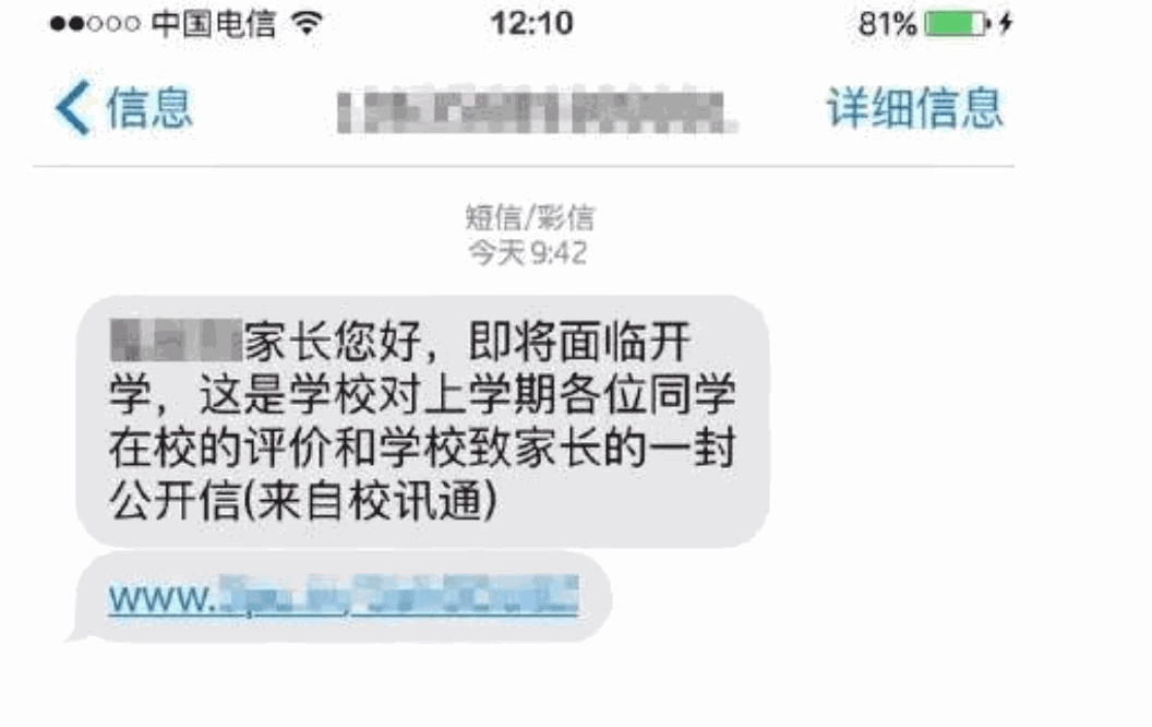 短信内容:某某家长,这是你孩子在本校一周的学习情况及档案资料,资料http:t.cn/RAfdawd.第一时间与您一起了解孩子在校情况。4减免学杂费