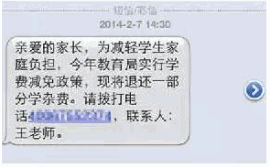 短信内容:亲爱的家长,为减轻学生家庭负担,今年教育局实行学费减免政策,现将退还一部分学杂费。请拨打电话400...,联系人:某老师。