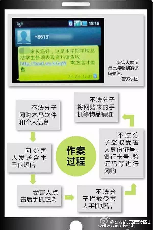 公安部打黑除四害专项行动办公室官方微博就曾发布消息,提醒各位同学和家长,收到以下这些信息,千万不要立即点击短信中的链接,也不要回复信息,最好直接联系学校老师进行核实,不给骗子可乘之机!