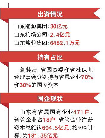 根据省政府决策,此次率先将山东能源集团、山东机场公司、山东盐业集团30%的国家股本,即分别为30亿元、2.4亿元及6482.1万元,划转社保基金理事会持有。