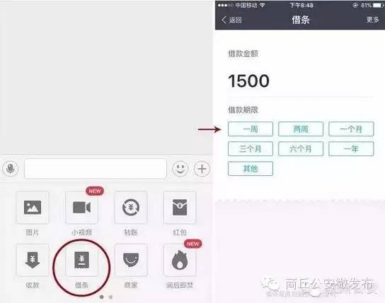 如图所示,在与好友的聊天窗口中,点击下方“+”内的“借条”选项,便可向对方借款,点击确认还款时间,即完成借款操作。