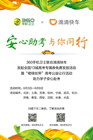 十年寒窗,在此一搏,伴随着社会对高考生的祝福,家长、老师的殷殷期盼,这关键的几天终于到来。360手机卫士和滴滴快车通过在全中国范围内的代金券发放,以及送考车让行的倡议,为全国高考生增添一份力量。