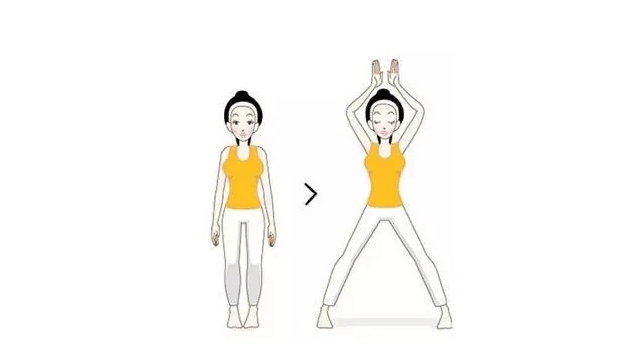 (开合跳:双脚并紧站立,双臂放在身体两侧。身体向上跳起,落地时双脚分开,同时把双臂举过头顶。然后跳起,落地时双脚并紧,双臂重新放回身体两侧。)