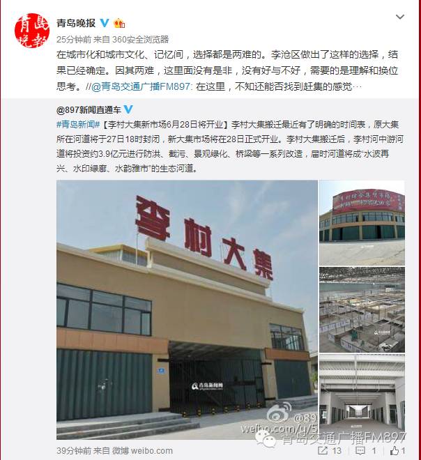 李村大集搬迁最近终于有了明确的时间表,原李村大集所在河道将于6月27日18时封闭,新李村大集市场将在6月28日正式开业。
