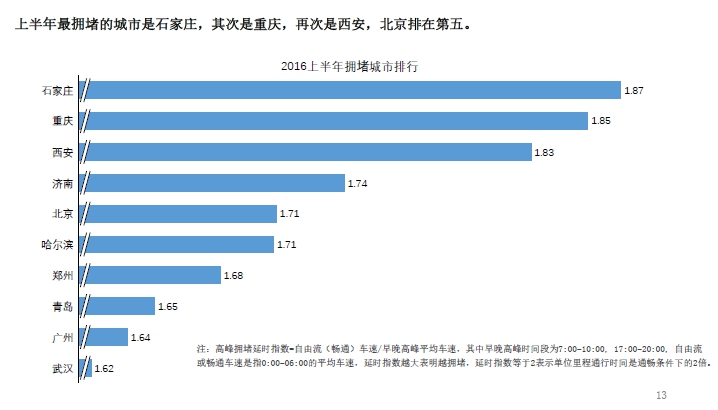 上半年中,全国最拥堵的城市是石家庄,拥堵延时指数达1.87,意味着早晚高峰期的通行时间要比凌晨时分多出87%。重庆、西安、济南分列二至四位,而哈尔滨、郑州、青岛、武汉等多个二三线的拥堵程度与一线城市中最拥堵的北京和广州不相上下。
