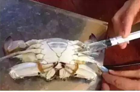 最近朋友圈疯传一条视频:视频中,一位大姐正拿着针筒给一筐蟹逐只注射橙色水浆。旁边还有一个人帮他递上装有橙色水浆的碗。