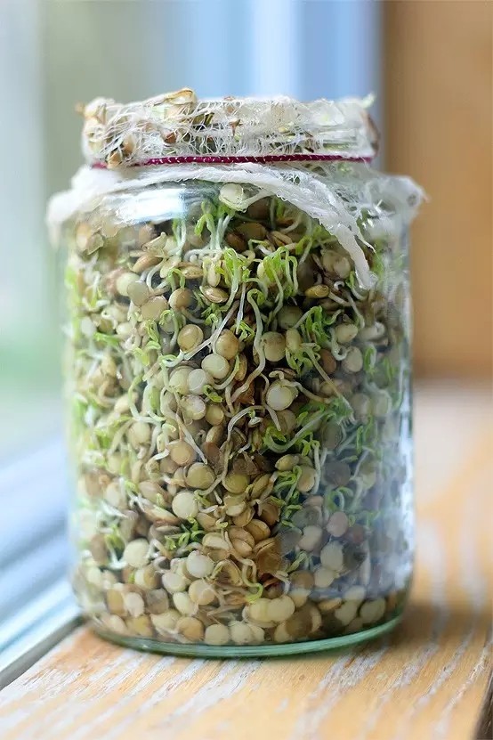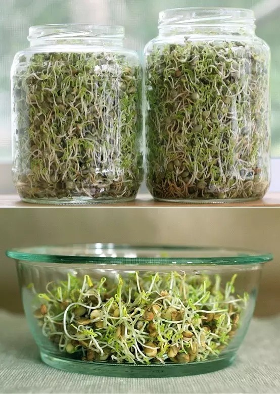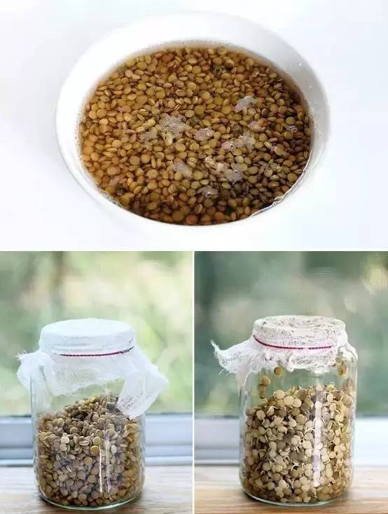 将豆子放在水里浸泡8个小时,绿豆、黄豆、黑豆都可以。然后过滤掉多余的水,将绿豆放到一个大的玻璃瓶里,高度以到玻璃瓶的1/3为宜。