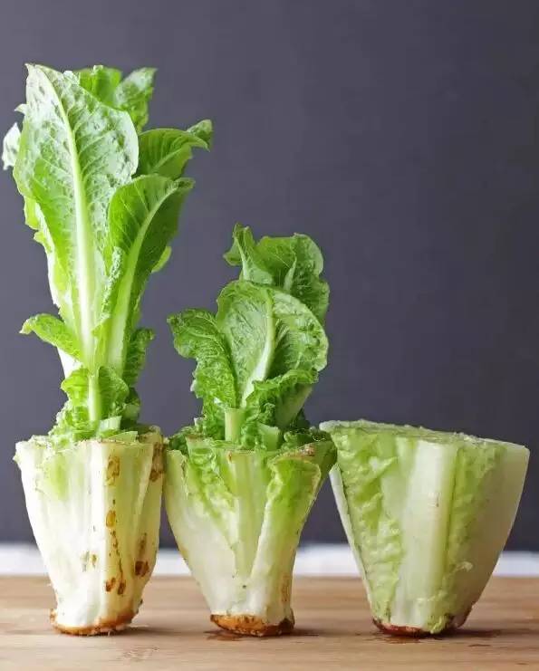 将生菜根茎放置到盛水的容器里,水位以刚漫过根部最合适,即1厘米左右。很快生菜就长高长大了。
