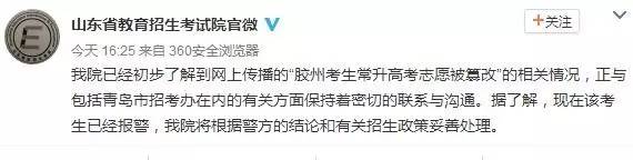我院已经初步了解到网上传播的“胶州考生常升高考志愿被篡改”的相关情况,正与包括青岛市招考办在内的有关方面保持着密切的联系与沟通。据了解,现在该考生已经报警,我院将根据警方的结论和有关招生政策妥善处理。