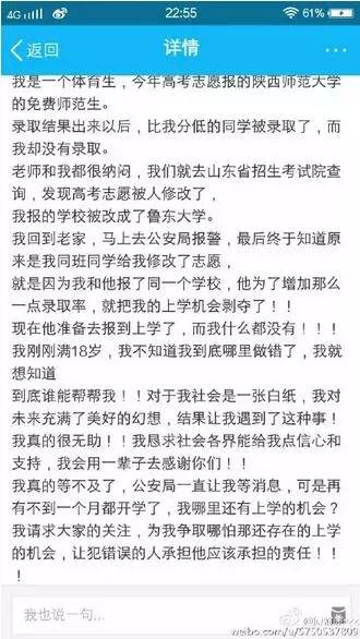 于是,双方家长开始了见面、协商。但显然,对方就是想把这件事拖过去,他显然也没学可上了。他说,如果不是陕西师范大学没有招满从而进行第二次征集志愿,他永远都不会发现这个秘密!