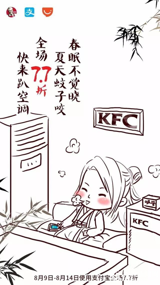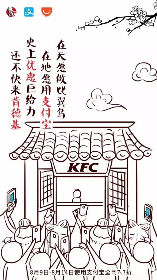 • 2016年8月9日-8月14日6:00-23:00,在肯德基餐厅使用,支付宝支付可享全场7.7折优惠(每单最多省10元)。