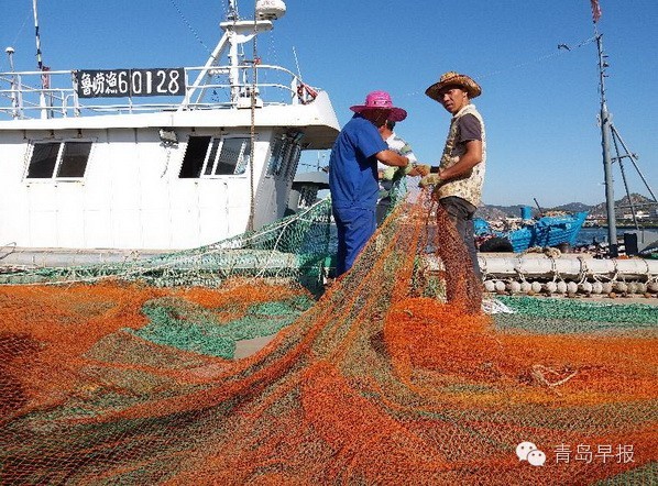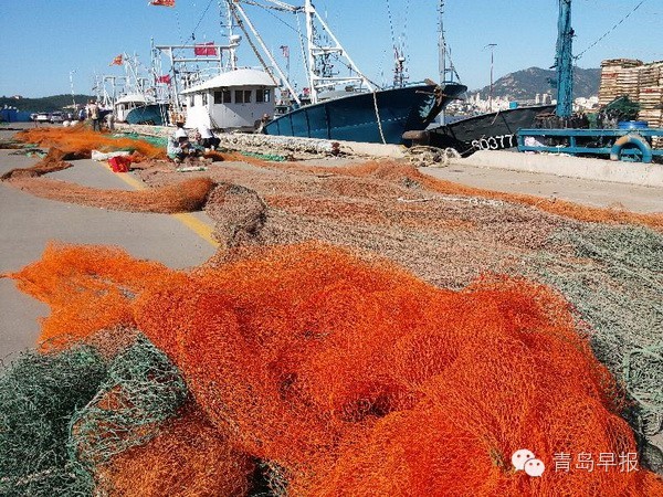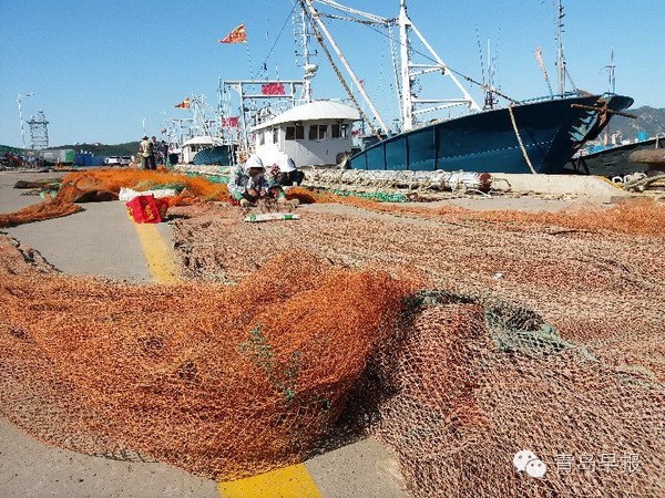 “出海前的网具准备,是最关键的一项工作。如果渔网不好,那收获肯定不会好。”在沙子口国家中心渔港码头上,几个渔民正在忙碌修补渔网。记者注意到,这张网长约60多米,采用不同颜色的渔网组合而成,渔民将一张张大网按照规定缝到一起,形成一张更大的“网阵”。
