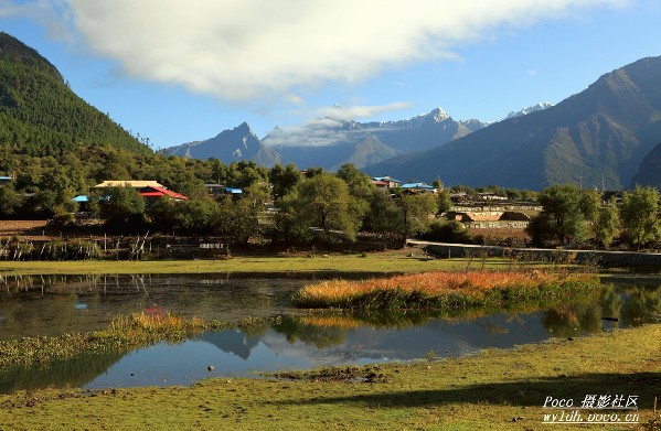 嘎朗湖约2平方公里,沿岸长满了水草、鲜花,四面的雪山、森林、村庄、田园尽收湖底。据说这里是鱼儿的放生之地,湖里鱼头攒动,悠游自在。