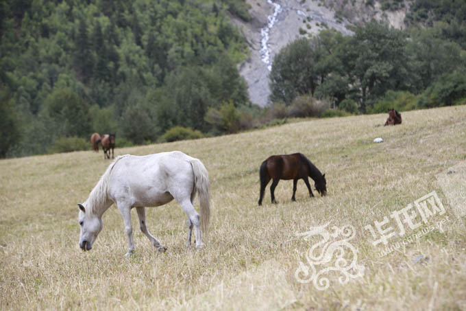米堆冰川的山下,几匹马在悠闲地吃着草。 特派记者 李文科 摄