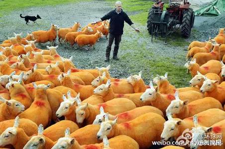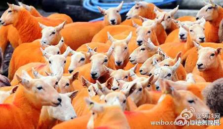 Exo me?这货不是得了白化病吗…感觉像蛆…不过是变了个色就这么神奇?近日英国某牧场上出现了一群橙色羊,然而这不是变异,而是经常丢羊,主人一气之下染了毛: 这么与众不同的羊不会有人偷了吧..