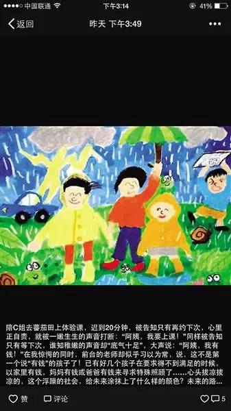 家教真的好重要。上周末,重庆一3岁女孩上培训班,迟到20分钟,老师以会打扰同学为由拒绝她进教室,建议约下次课。不料小女孩两次大喊 “我有钱”,被拒后才离开。老师称,几乎每个月都有小孩在不被满足需求时说自己有钱,爸爸有钱或妈妈有钱…