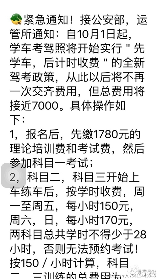 今天上午,有市民反映称,微博、朋友圈里都有人在传:10月1号起,学车考驾照将开始实行“先学车,后计时收费”的全新驾考政策,从此以后将不再一次性交齐费用,但总费用将接近7000。