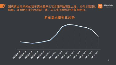 滴滴租车的大数据显示,十一黄金周7天的租车需求量比前一周增长了154.1%。从9月29日开始,租车需求量呈上涨趋势,10月2日到达峰值,在10月5日之后逐渐下降,与人们长假出行的规律吻合。从出行高峰期来看,9月30日租车需求量环比9月29日增长了60.4%,10月1日环比9月30日则增长了54.5%。