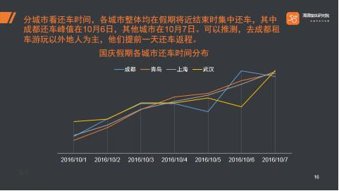 还车的时间也同样符合长假出行的规律,人们集中在10月6日和10月7日这两天还车,不过不同城市略有差异。比如成都还车峰值在10月6日,而其他城市在10月7日。从自驾规律来看,在成都租车游玩以外地人为主,比如去川西走318或者川北去九寨沟,他们提前一天还车返程。也有一种可能,成都人民没那么爱浪,想休息一天。