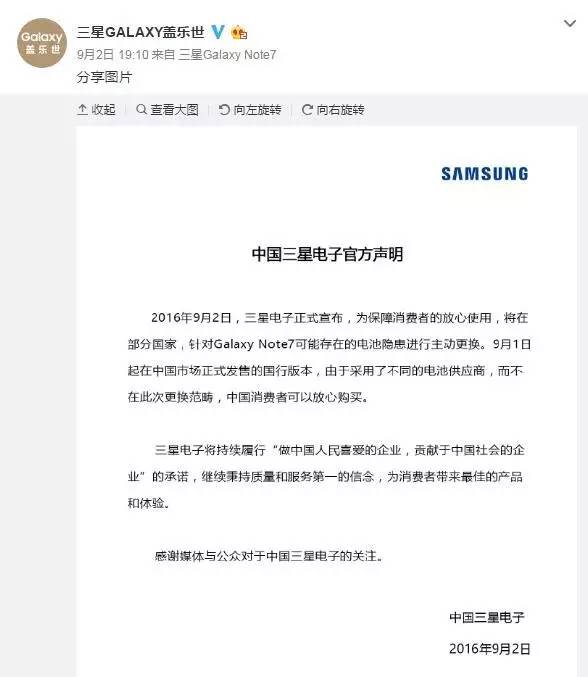 在9月2日发布的声明中,三星中国强调国行Note7使用的香港新能ATL的电池是安全的;随后又发布声明,将中国市场1858台问题Note7召回,继续强调国行版没有问题。