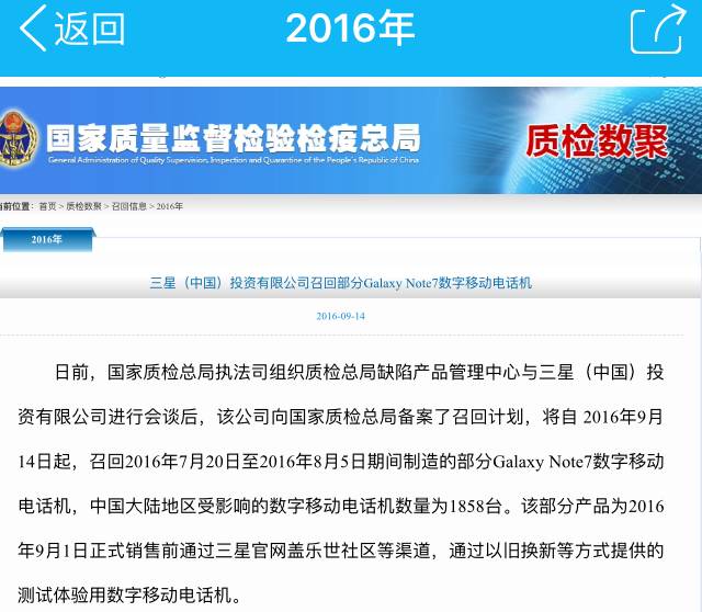 △ 9月14日,国家质检总局公告,1858台Note7将通过以旧换新的形式召回。
