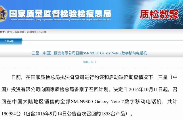 10月11日三星终于宣布大陆召回10月11日,国家质检总局公布三星Galaxy Note7手机召回公告,召回范围为三星在大陆地区所售的全部Note7手机,共计190984台。中国大陆区消费者终于得到了与全球消费者一样的待遇。为何这么说?往下看。