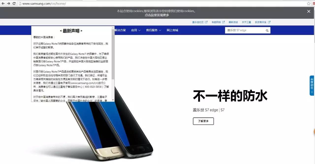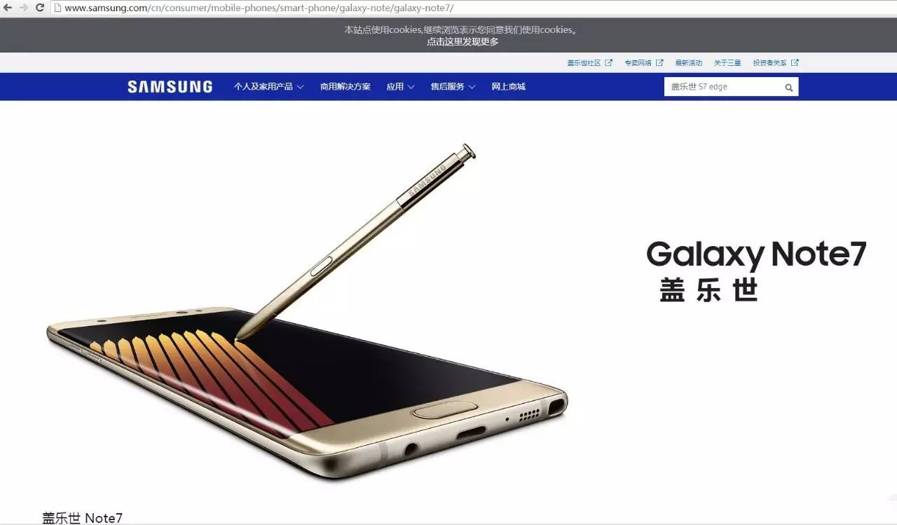 在10月11日的声明中,三星两次致歉。但是Note7的产品页面上,并无召回、致歉内容。