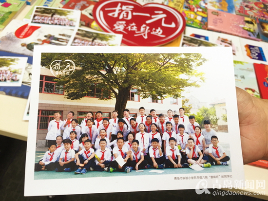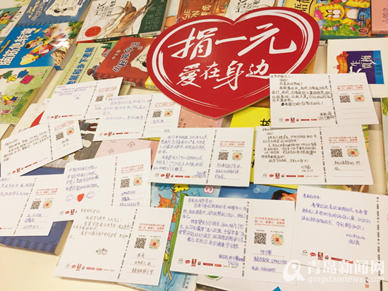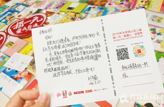 多年参加捐一元项目的小公益宣传员郭昊谦也热情发动青岛市实验小学五年级六班的全班同学们一起捐书,传递爱心与温暖。孩子们还特别定制了别具特色的专属明信片,虽然与山区小伙们素未谋面,但大家都十分真切的想与他们交朋友,每张明信片上都倾注了同学们的真情实意。他们说,虽然不能亲临河北,但是很想把对山区小伙伴们的祝福传递到那里,并且和他们成为好朋友,交流学习心得,互相支持和鼓励。海的这边与山那边的孩子们,通过这种特殊的方式,连接起了友谊的纽带。