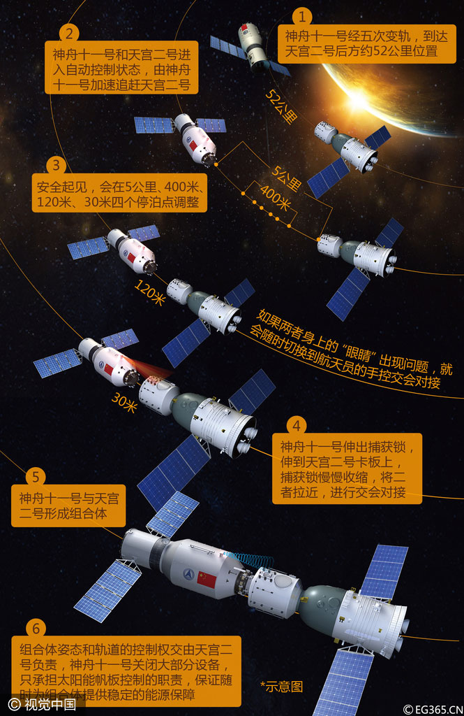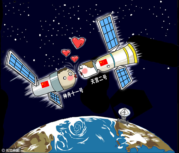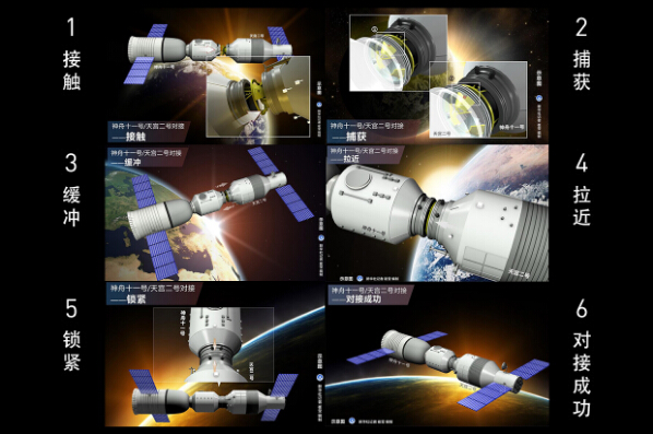 之后,捕获、缓冲、拉近、锁紧……神舟十一号与天宫二号成功实现自动交会对接,“太空之吻”圆满完成。