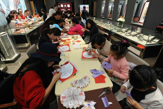 上周末,周大福携手山东财经大学创行学生团队,特邀莒县剪纸手艺人于红老师,在青岛万象城周大福名贵珠宝专营店,带领周大福会员朋友们一起走进剪纸艺术,聆听剪纸艺术背后的故事。