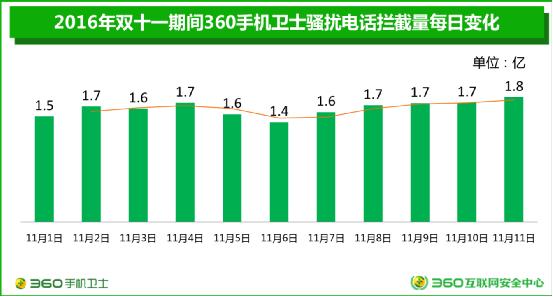 双十一期间360手机卫士平均每天拦截的骚扰电话多达1.6亿次