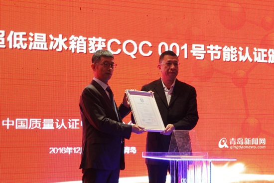 青岛新闻网12月26日讯 近日,席卷全国11个省市的雾霾深深影响人们的健康和生活,而低温制冷行业一项节能减排成果的发布,将令我们每个人为保护环境奉献绵薄之力。今天,在青岛举行的山东组织生物样本库标准化建设研讨会上,中国质量认证中心(简称:CQC)杨超处长向海尔生物医疗刘占杰博士颁发了中国超低温冰箱行业001号节能环保认证。此认证的获得,改变了中国低温制冷行业没有节能环保认定的历史,填补了此项领域的空白。