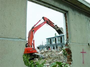 “很多违法建筑都是在楼前楼后建的,中间的房子是有证的,所以这次拆除工作难度很大。”执法人员说,就在拆除一处二层楼时,除了有一些村民在现场拍照外,还有两名当事人站在前面房子的房顶上,现场监督施工。执法人员没有办法,只有让两台挖掘机上阵,前后夹击来强拆。挖掘机一推,其中一堵墙朝前面房子倒去,虽然没有砸着前方房屋,两名当事人还是情绪失控,竟然在房顶平台上朝挖掘机连扔四五块砖头,然后又跑出屋外,口出脏言要找挖掘机司机理论一番,被执法人员拦了下来。