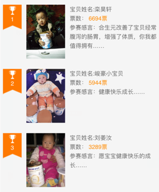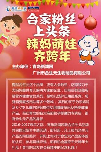 2016-2017跨年之际,青岛新闻网联合广州市合生元生物制品有限公司共同推出“合家粉丝上头条辣妈萌娃齐跨年”的网络评选活动,活动自2016年12月23日发布起,截止2017年1月5日投票结束,历时半个月时间,受到了广大网友和合生元用户的追捧,活动总点击量过万,参与人数46人,总投票数24200余票,在辞旧迎新之际献上了贺岁之喜。